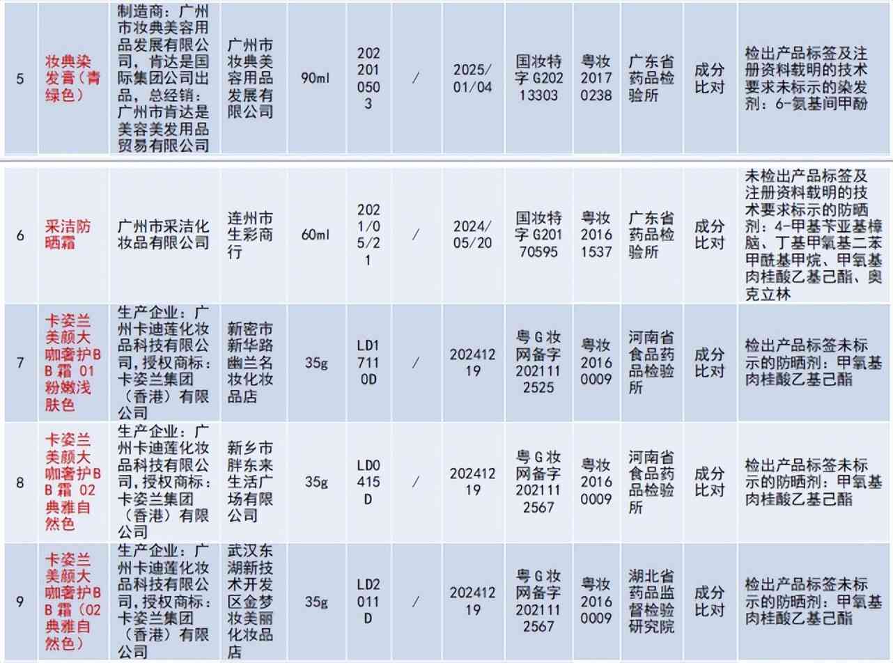 廣州卡迪蓮化妝品科技有限公司生產(chǎn)的卡姿蘭美顏大咖奢護(hù)BB霜 01粉嫩淺膚色、卡姿蘭美顏大咖奢護(hù)BB霜 02典雅自然色、卡姿蘭美顏大咖奢護(hù)BB霜(02典雅自然色),成分比對(duì)不合格;