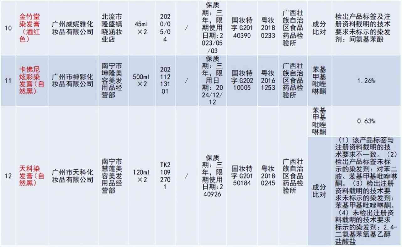 廣州威妮雅化妝品有限公司生產(chǎn)的金竹堂染發(fā)膏(酒紅色),成分比對(duì)不合格;