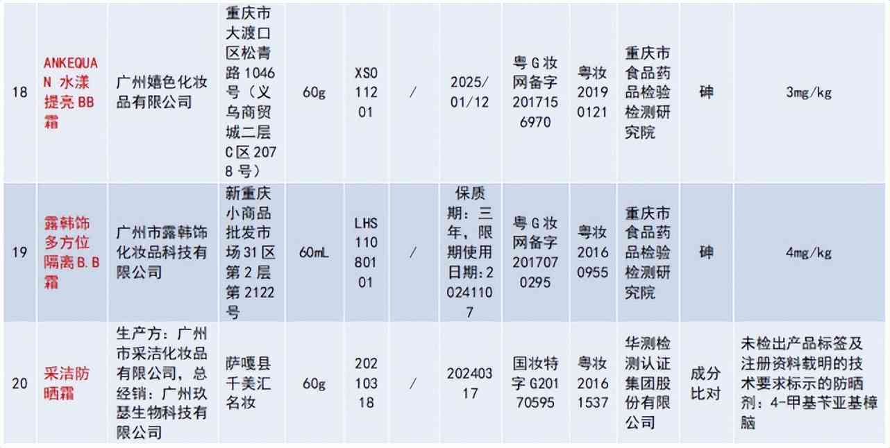 廣州市露韓飾化妝品科技有限公司生產(chǎn)的露韓飾多方位隔離B.B霜,,被檢出砷(4mg/kg);