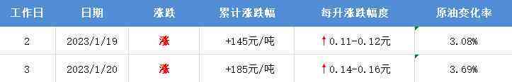 1月20日,本輪油價計價統(tǒng)計周期第3個工作日,當(dāng)前原油變化率為3.69%,預(yù)計汽柴油累計上調(diào)185元/噸,折算為升算上調(diào)0.14-0.16元/升。下次油價調(diào)價時間為:2月3日24時。