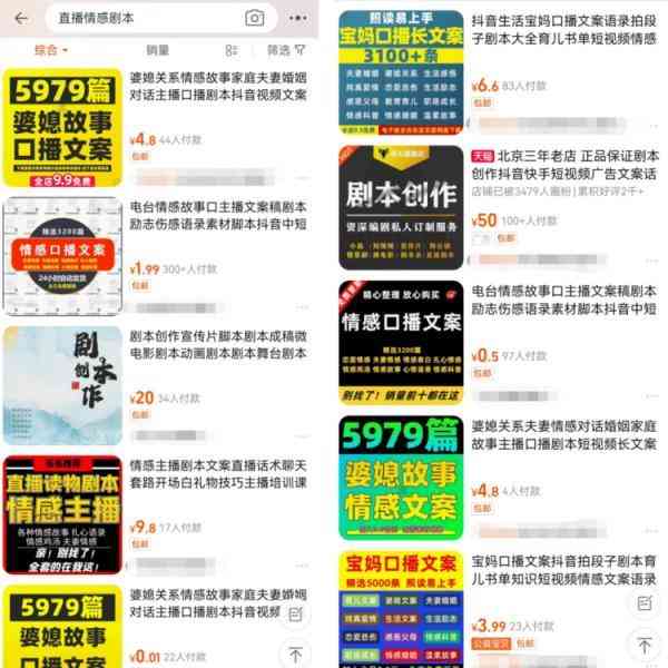 一名賣家稱,婆媳關系、夫妻關系、家庭生活等一些“苦情戲”劇本,在中老年受眾中比較受歡迎。而記者在某電商平臺搜索發(fā)現(xiàn),這些劇本售價最低僅需幾塊錢。