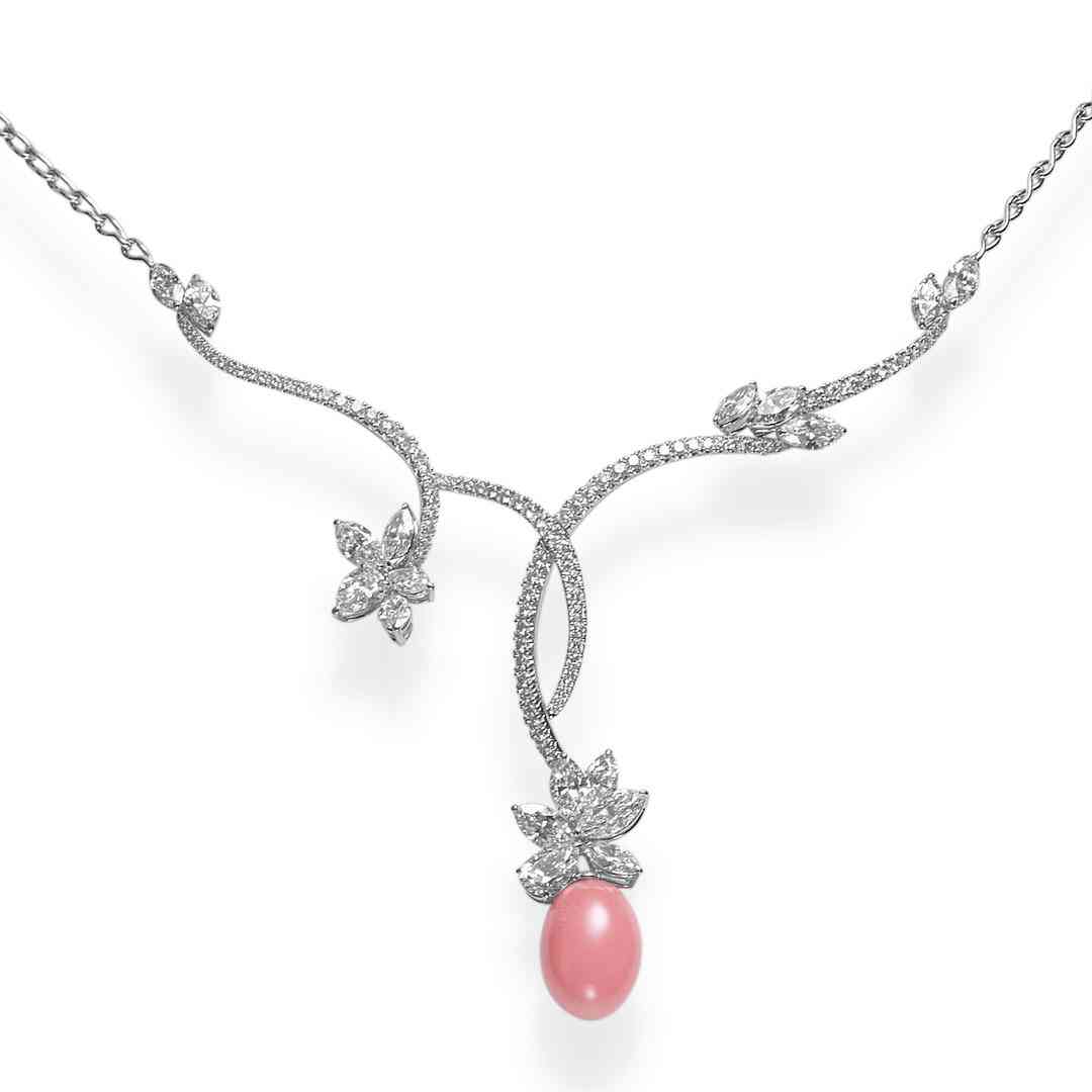 除了前文提到的超稀有的44.55克拉海螺珍珠戒指,Morris最近設計了上圖這條項鏈,目前正在巴黎新開的品牌精品店中出售。Morris說:“我花了7年的時間搜集這些珍珠,真正的愛的證明。這條項鏈最后的珍珠來自一對海螺珍珠鉆石耳環(huán),我敢說我選用了整條龐德街最好的海螺珍珠。”