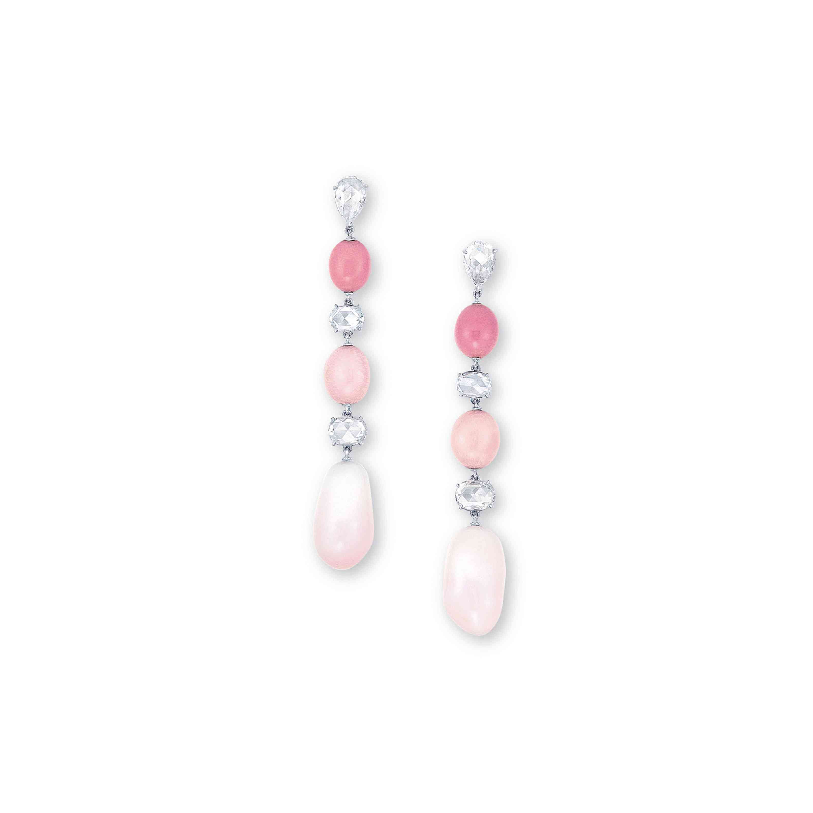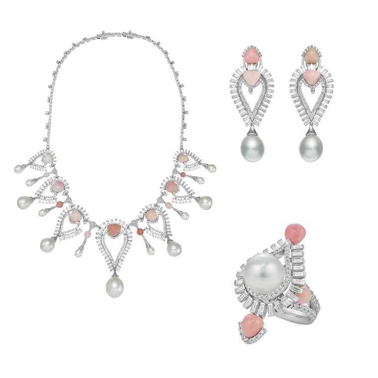 她的秘密花園系列包括上方的Persica套裝,運用了各種粉色、不同形狀的海螺珍珠,一些還是三角形的。“我看到這些不同的顏色,從橡皮粉到艷粉色,讓我想到放了糖漬水果的冰激凌,Persica 項鏈中用到的三角形珍珠非常稀有,花費兩年時間才找到。這些讓Persica套裝無與倫比?!?/p>