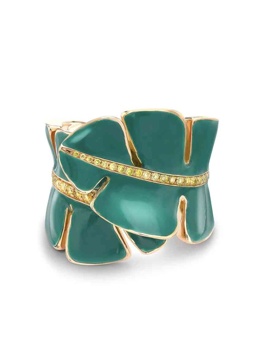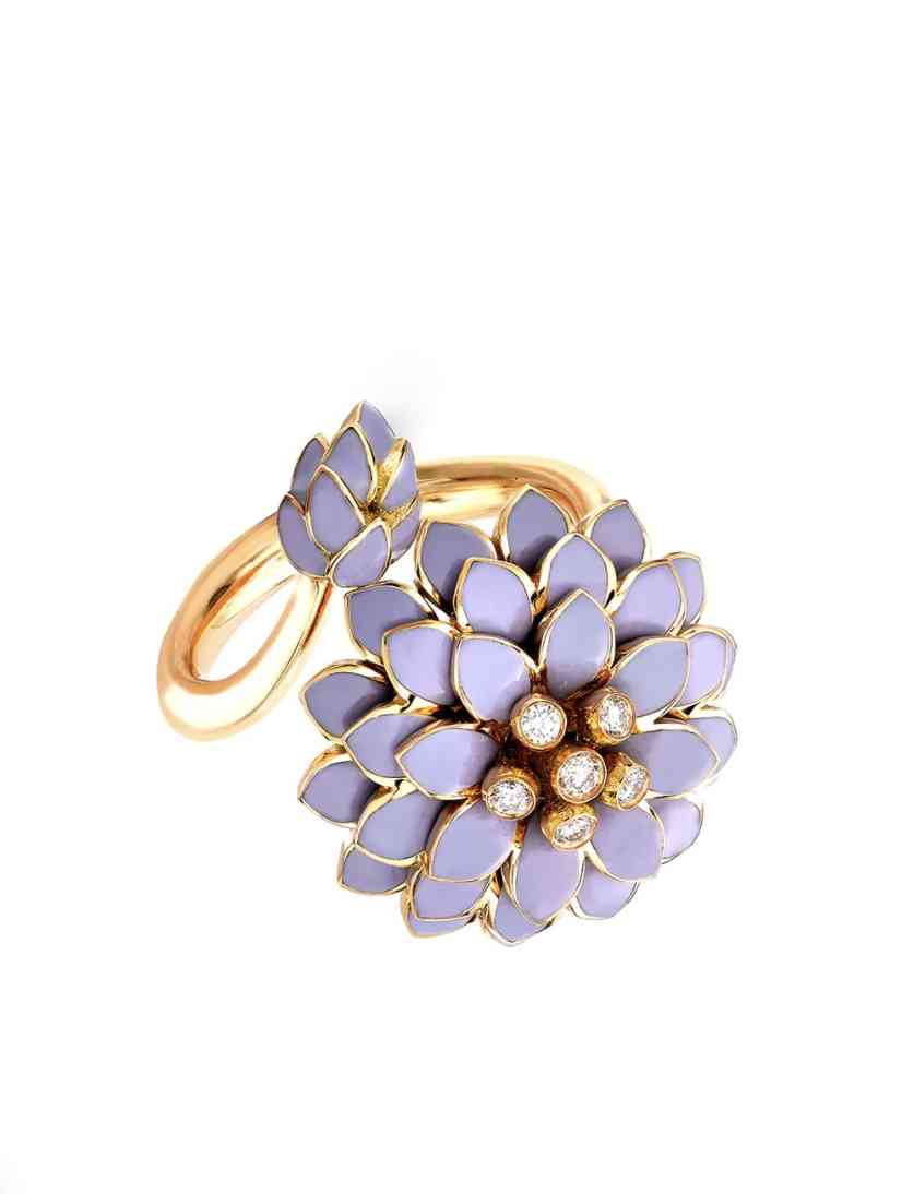 不同于一般時裝珠寶采用的琺瑯工藝,華洛芙的冷琺瑯技術(shù)可以順著黃金延展,配合不同層面的雕刻技術(shù),使珠寶色彩絢麗。用這種工藝制成的琺瑯珠寶,更加耐撞和耐壓,所以佩戴者在忙碌的工作生活中也不用擔(dān)心戒指被壓壞或者出現(xiàn)劃痕。