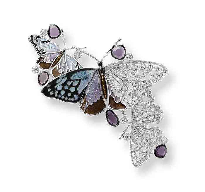 如今許多造型美輪美奐的新藝術(shù)珠寶,都采用了透光琺瑯工藝。比如Mikimoto這件蝴蝶胸針,就將透光琺瑯與鉆石結(jié)合,打造奢華又不失清新靈動感的高級珠寶。