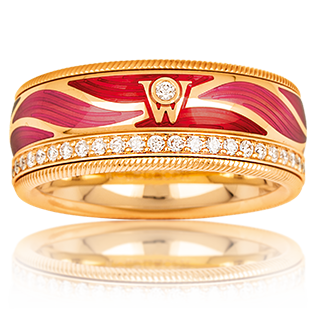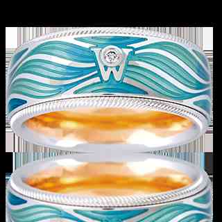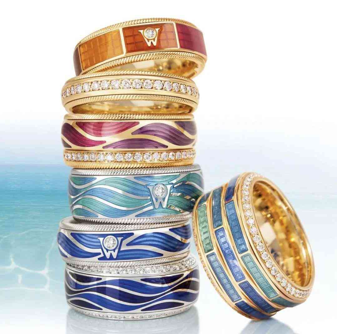 華洛芙推出了眾多琺瑯珠寶,其中最受歡迎的是旋轉(zhuǎn)指環(huán)。每個華洛芙指環(huán)均由至少4個獨(dú)立指環(huán)排列而成,研制的冷琺瑯技術(shù)配合三個不同層面的雕刻技術(shù),展現(xiàn)巧妙的光影效果,色彩更為鮮艷通透。