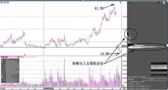 如圖2-26所示,聯(lián)美控股(600167)的日K線中,股價(jià)持續(xù)頂部橫盤(pán)震蕩,最終在圖中所示的位置出現(xiàn)了單峰籌碼形態(tài)。該股的見(jiàn)頂回落行情,就出現(xiàn)了該頂部形態(tài)出現(xiàn)之后。投資者在該股頂部橫盤(pán)調(diào)整過(guò)程中,只要留意一下籌碼的形態(tài),就可以輕松地抓住減倉(cāng)的位置了。股份持續(xù)下跌的過(guò)程,顯然就在這個(gè)單峰籌碼形態(tài)出現(xiàn)之后。