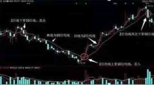 操作其實(shí)很簡(jiǎn)單,大家先把多余的均線去掉,設(shè)定好2日線和10日線。如果2日均線上穿10日均線,我們可以大膽買(mǎi)入,相反,2日均線下穿10日均線,則可以果斷賣出。(如下圖)