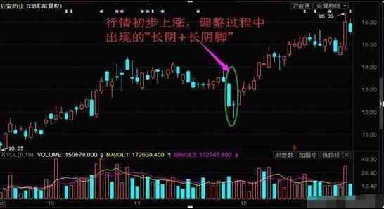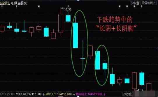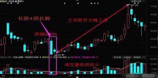 3、 大陰+陰長(zhǎng)腳,這兩個(gè)交易日當(dāng)中,如果成交量相對(duì)較小,那么后期股價(jià)上漲的概率就會(huì)更大。如果成交量相對(duì)較大,則后期股價(jià)上漲的概率沒(méi)有前一種情況的概率大。(當(dāng)然一般情況下,形成大陰線不太可能伴隨很小的成交量)