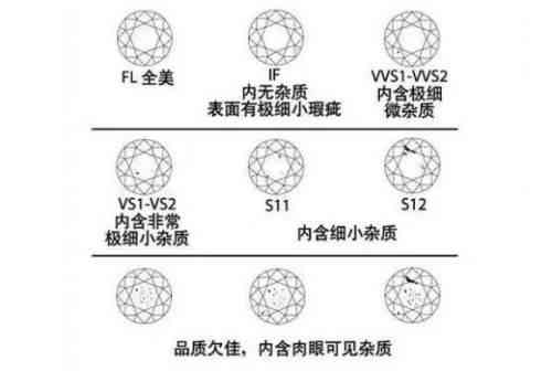 鉆石首先關(guān)注的應(yīng)該是“凈度”,越干凈的鉆石等級越高、價(jià)格也越高。目前國際上通行的標(biāo)準(zhǔn)是美國GIA學(xué)院制定的,“凈度”等級從高到底依次為: