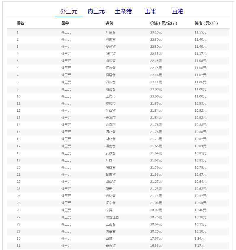 外三元排行前三:廣東省23.10元/公斤、海南省22.80元/公斤、貴州省22.80元/公斤;