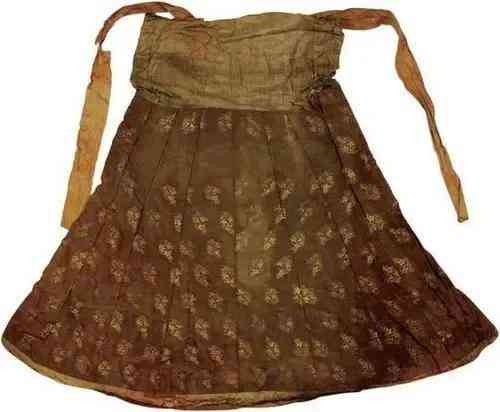 接著,專家們再把女主人的"龍袍"除去,又一件匪夷所思的衣物出現(xiàn)了,這是一件九百年前的女性吊帶裙,在吊帶裙的內(nèi)側(cè)有兩個漢字:"內(nèi)省"。