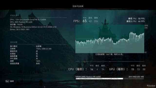 考慮到RX6400的性能,我們選取了10款對顯卡性能不同要求的游戲,統(tǒng)一在1080P分辨率下進行benchmark測試,不開啟光線追蹤和FSR,關閉垂直同步,默認高畫質,部分游戲由于對顯存容量具有一定要求,為了避免爆顯存產生幀數(shù)瓶頸,有三款游戲會降低畫質進行測試。