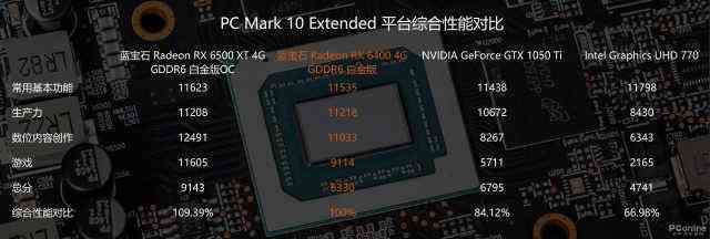 日常體驗測試小結:PCMark10Extended測試會綜合整套平臺的性能進行評估,基于同樣的測試平臺下,RX6500XT和RX6400在總分上沒有拉開較大差距。但由于其余兩款顯卡在性能上差距過于明顯,所以整體分數(shù)被前面兩款A卡大幅超越。