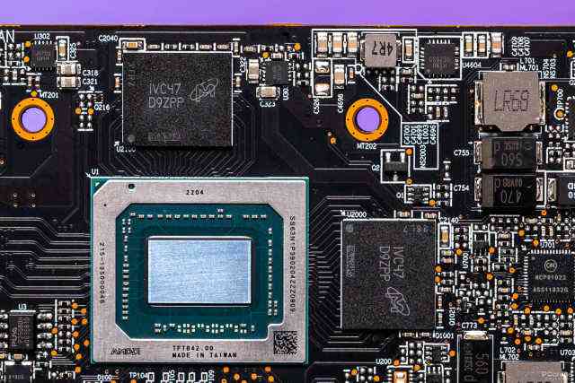 核心旁是兩顆來自美光的GDDR6顯存顆粒,F(xiàn)BGA編號為IVC47-D9ZPP,單顆顯存容量為2GB。