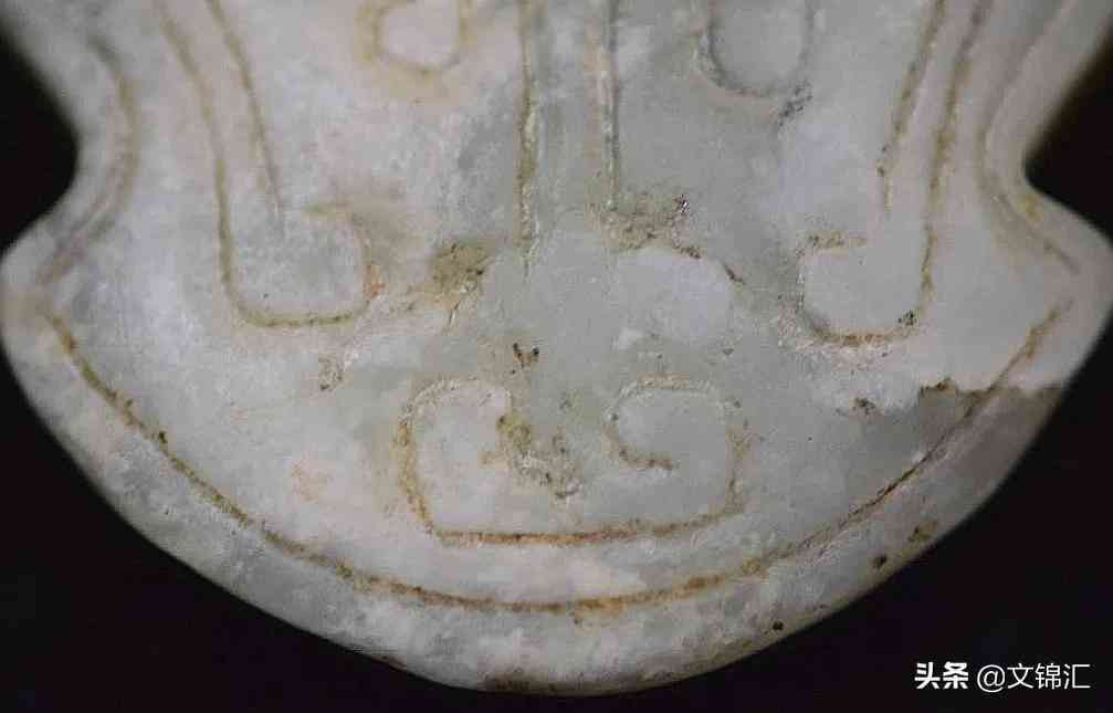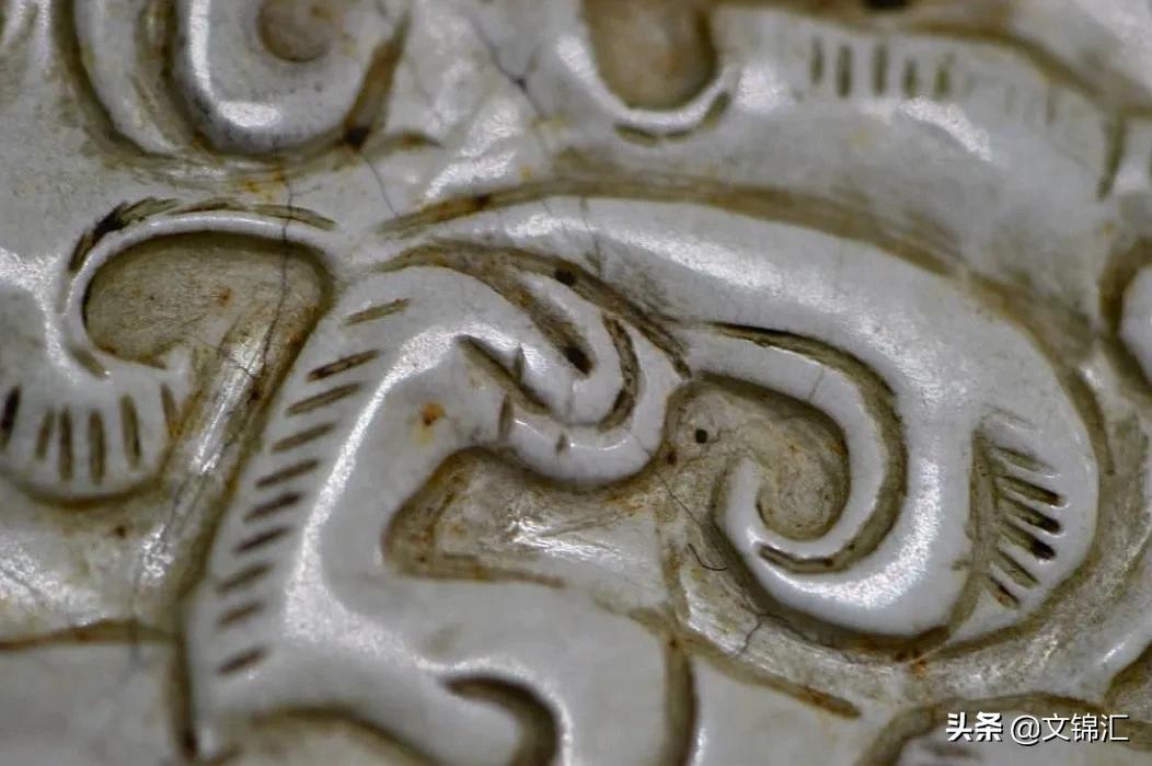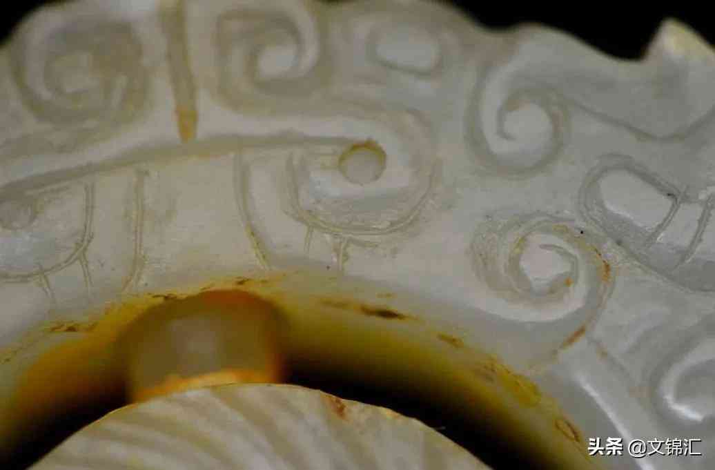 明代玉器細部圖。工痕內(nèi)外皮殼一致沁色漫布,底槽較深線條順暢,轉(zhuǎn)彎處砣痕接刀緊湊。