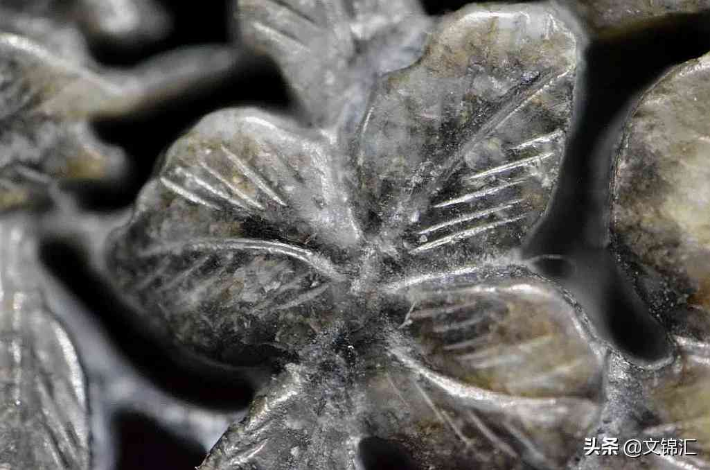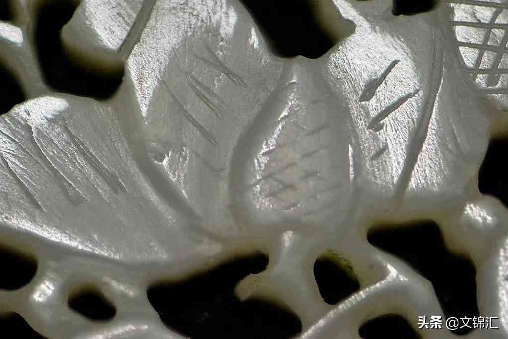 清代花卉玉器細部圖。花瓣全部用砣子挖一凹槽形成,邊緣修飾圓潤,陰線細密排列,鏤空處可看到先以一個圓向另一端延伸偶有以鋸齒狀是拉絲工藝,用桯鉆先打一圓孔然后用鋼絲順著圓孔向前不斷的拉伸,所以會出現(xiàn)這些特征。