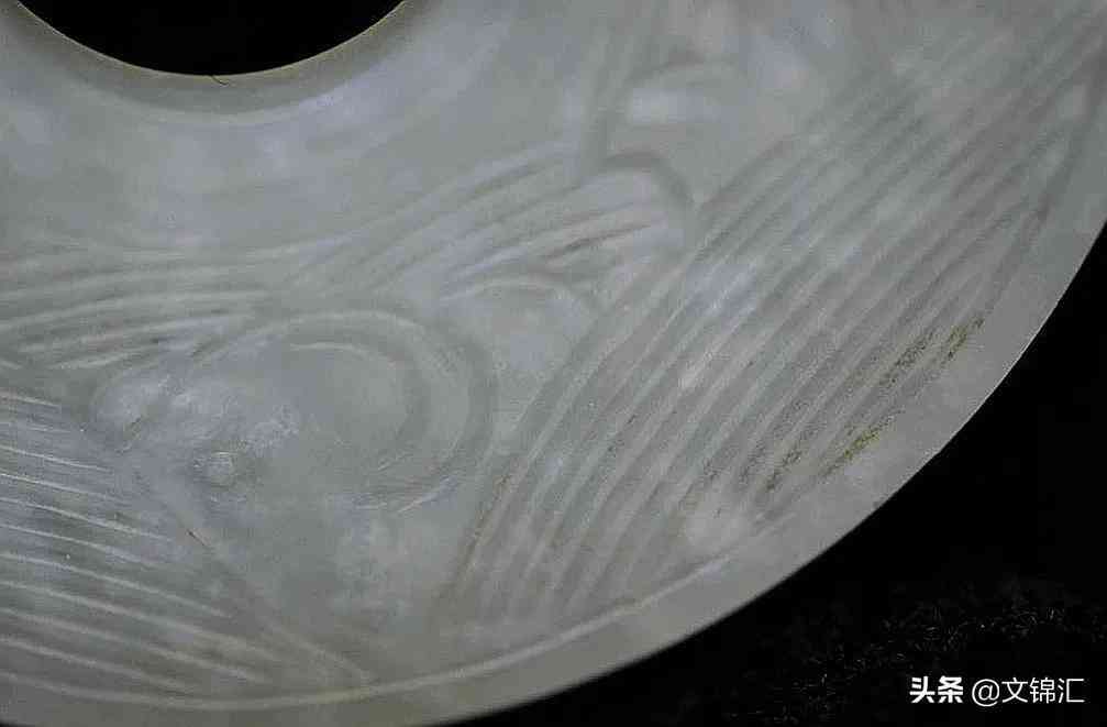 西周璇璣細部圖。這件玉器表皮似果凍狀,如同蒸熟的梨子,由內(nèi)到外可看到變化不同的色澤,布滿整個玉器,這便是所說的包漿。玉器的沁色和白皮交雜著漫布在一起布滿整個玉器,這也是包漿。玉器的沁色和白皮交雜著漫布在一起,并不均勻卻顯得很自然,而且這種質(zhì)變是由里向外的。
