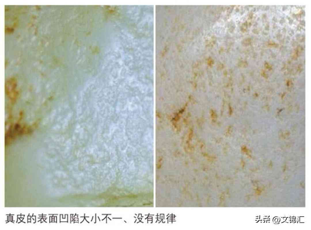 2,仿制的皮色比較鮮明、統(tǒng)一、沒有層次感,裂隙里留有染色劑類沉積物,有裂縫的地方,通常顏色較深。