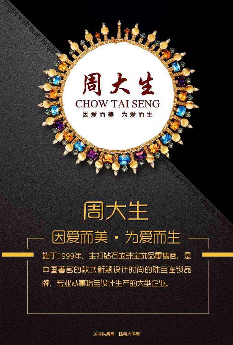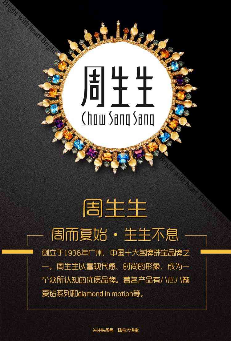 創(chuàng)立于1938年廣州,中國十大名牌珠寶品牌之一。周生生以富現(xiàn)代感、時尚的形象,成為一個眾所認(rèn)知的優(yōu)質(zhì)品牌。著名產(chǎn)品有八心八箭愛鉆系列和diamond in motion等。