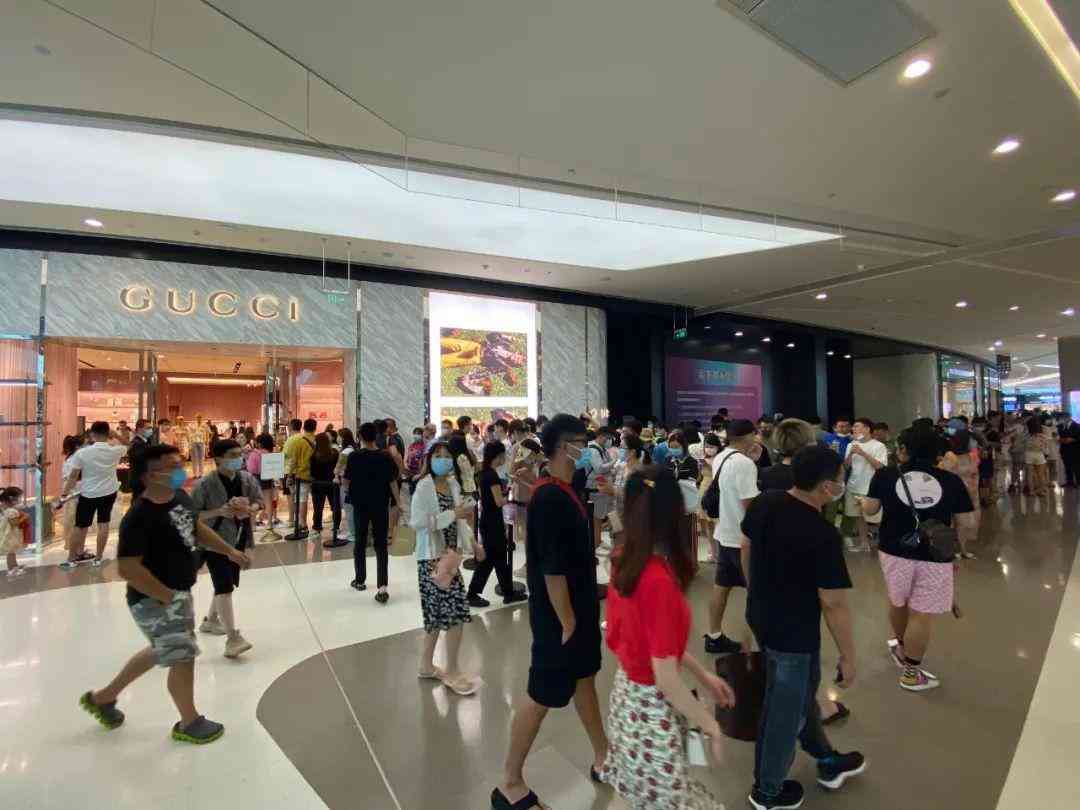 13時(shí)左右,記者看到,免稅城內(nèi)的人更多了,一些此前沒(méi)有排隊(duì)的門(mén)店也開(kāi)始排起了長(zhǎng)隊(duì),而此前已經(jīng)在排隊(duì)的門(mén)店排隊(duì)人數(shù)也增加了不少。其中,現(xiàn)場(chǎng)最為“火爆”的是古馳門(mén)店。門(mén)口的保安告訴記者,從排隊(duì)到進(jìn)入門(mén)店大約需要一個(gè)半小時(shí)。