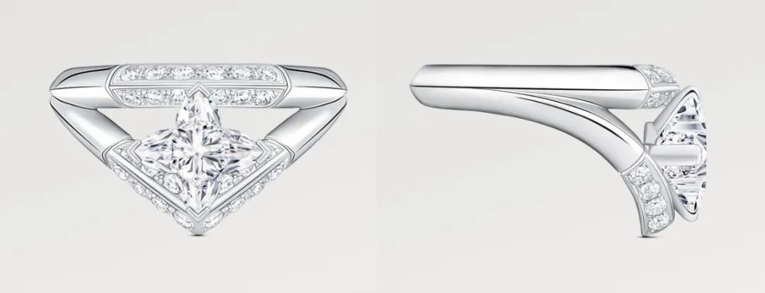 另外這款Pavé Double Ring更有存在感。正面看是三角形結(jié)構(gòu),V字弧線清晰可見,側(cè)面看像延伸出了另一個平面,加上Monogram星形切割主鉆的烘托,顯得立體感十足,戒圈上更點(diǎn)綴了一顆顆閃耀的鉆石,增添華麗效果。