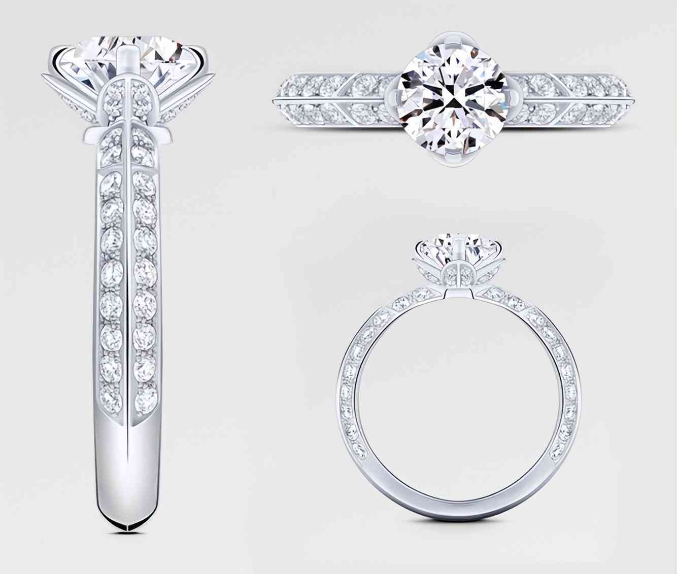 和前面的Monogram星形切割鉆石款一樣,這枚明亮圓形切割鉆石戒指同樣有Pavé Solitaire和Solitaire兩款可選,一款輔鉆較多,另一款相對更簡約。
