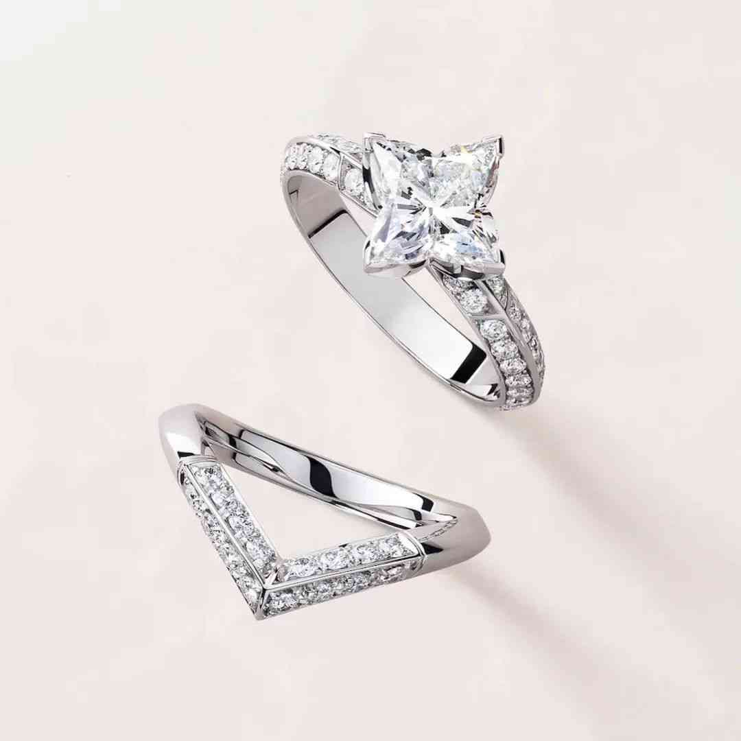 Pavé Solitaire醒目的Monogram星形切割鉆石位于正中央,分別有1.2克拉和1克拉可選(如果想要2克拉以上的尺寸,還可以到店咨詢)。戒圈的設(shè)計十分有特色,中間的V字細(xì)節(jié)象征著LV的字母logo,還鑲嵌了許多細(xì)密的鉆石,閃耀的同時,還烘托出主鉆的光芒,記憶點(diǎn)十足。