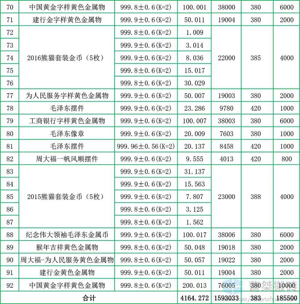 黃金是貴金屬的一種,自古以來就是基本等同于貨幣的存在,雖然如今黃金已經(jīng)不能作為貨幣流通,但因其相對保值的屬性,成為了老百姓投資的主要實(shí)物產(chǎn)品之一。目前,國內(nèi)足金(非飾品)市場價(jià)在380元/克左右。本次拍賣的黃金制品中,足金金條售價(jià)與市場價(jià)基本持平。紀(jì)念幣和擺件因其帶收藏、觀賞屬性,價(jià)格略高一點(diǎn),但也在合理范圍之內(nèi)。的一件飾品(手鐲)單價(jià)高達(dá)521元/克,是否物有所值,就需要看各人對其制作工藝及飾品外觀的認(rèn)可程度了。