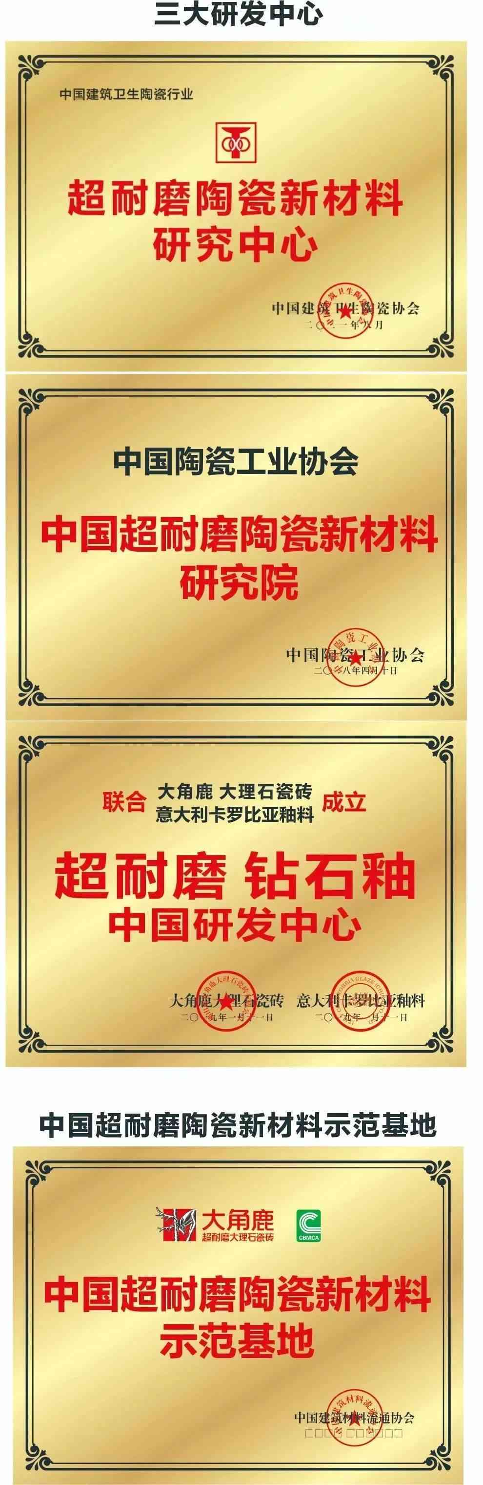 不僅如此,大角鹿還是三大研究機構(gòu)認定的“超耐磨中心”。除了擁有中國建筑衛(wèi)生陶瓷協(xié)會認定的“超耐磨陶瓷新材料研究中心”,還有中國陶瓷工業(yè)協(xié)會認定的“中國超耐磨陶瓷新材料研究院”,以及中國建筑材料流通協(xié)會認定的“中國超耐磨陶瓷新材料示范基地”。
