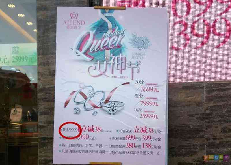 據(jù)了解,在消費(fèi)者購(gòu)買(mǎi)黃金時(shí),往往以“千足金”、“萬(wàn)足金”為標(biāo)準(zhǔn)判斷黃金的優(yōu)劣,小編在購(gòu)物中心珠寶店走訪(fǎng)時(shí)發(fā)現(xiàn),很多珠寶店在消費(fèi)者選購(gòu)黃金時(shí)仍以“千足金”、“萬(wàn)足金”為賣(mài)點(diǎn),并且價(jià)格不等,珠寶店的銷(xiāo)售賣(mài)點(diǎn)正是為了迎合消費(fèi)者的選購(gòu)心理。