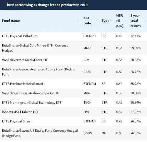 具體到品種來看,2019年表現(xiàn)好的ETF產(chǎn)品多和貴金屬相關(guān),其中表現(xiàn)最好的是鈀金,截至12月20日漲幅72.42%。表現(xiàn)差的為現(xiàn)金收益品種以及做空基金,其中最差的是做空澳洲股市的ETF,今年跌幅為36%,同期澳洲標(biāo)普200指數(shù)漲幅超20%。