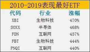 過去十年來看,表現(xiàn)最好的品種多和生物科技、互聯(lián)網(wǎng)相關(guān),其中表現(xiàn)最好的是標(biāo)普生物科技ETF(XBI),十年間漲幅為470%。