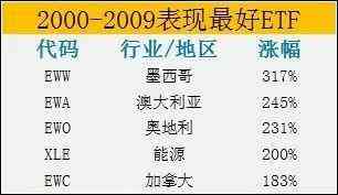 但是再往前推十年(2000-2009),表現(xiàn)最好的品種來自新興市場(chǎng)以及大宗商品,其中漲幅最高的是iShares墨西哥指數(shù)(EWW),十年間漲幅為317%,真實(shí)演繹了十年河?xùn)|十年河西。