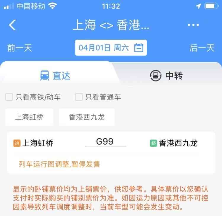 記者今天在12306客戶端查詢,4月1日上海虹橋至香港西九龍暫時顯示“暫停發(fā)售”。