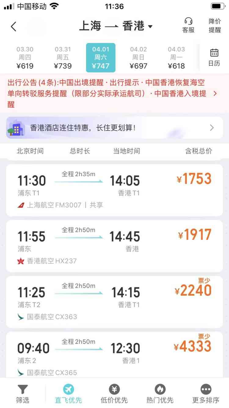 記者查詢了從上海飛香港的機票價格,4月1日,較低的票價是廈門航空從虹橋起飛經(jīng)福州轉(zhuǎn)機的航班,747元;東航有從浦東直飛香港的,票價943元。其他航班的價格大多在1500元至2000元之間。所以,如果單純從價格來看,買高鐵的一等座、二等座,票價比飛機便宜一點。