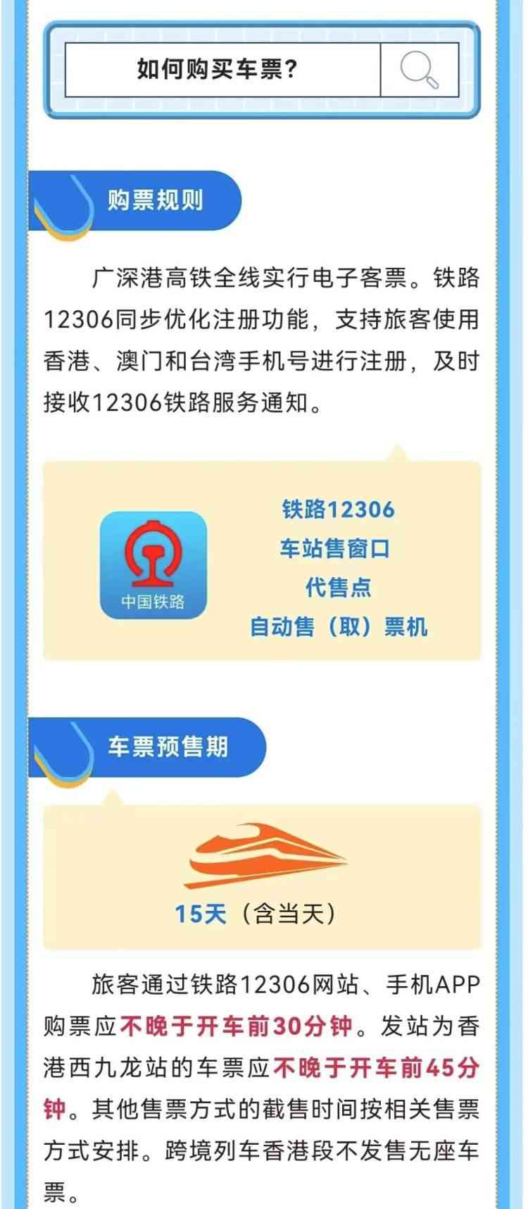 根據(jù)國鐵集團消息,4月1日起新增開的跨境高鐵列車車票將于3月23日6時起開售,各個車站開售的時間可能有先后,旅客可通過鐵路12306網(wǎng)站(含客戶端)、車站售票窗口、代售點、自動售(取)票機等多種方式購買內(nèi)地與香港往來的高鐵票。