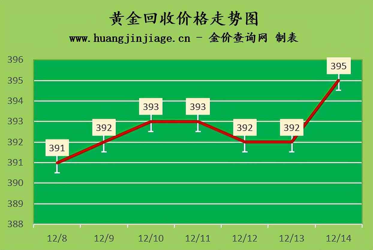黃金回收價(jià)格395元/克,鉑金回收價(jià)格199元/克,鈀金回收價(jià)格390元/克,18K金回收價(jià)格292元/克,銀條回收價(jià)格4元/克。(黃金行情是波動的,回收金價(jià)沒有固定標(biāo)準(zhǔn)。)