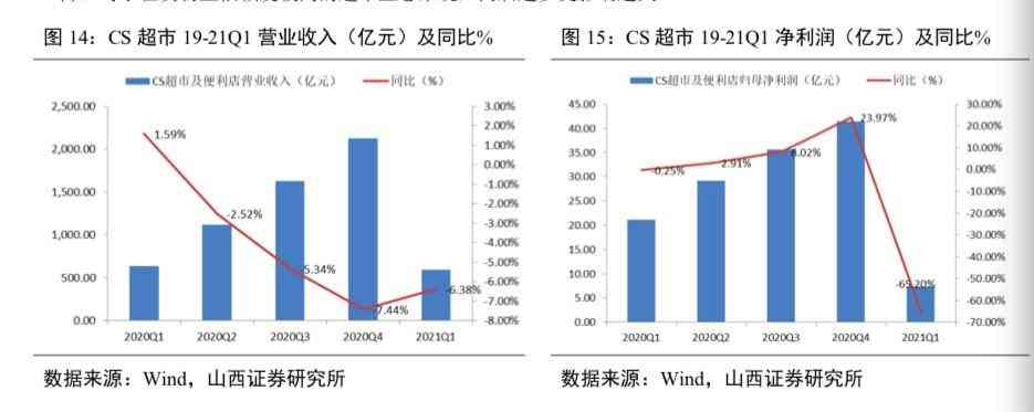受社區(qū)團(tuán)購影響的不止永輝一家。山西證券研究所5月14日發(fā)布的研報指出,我國零售行業(yè)一季度持續(xù)回暖,但樣本為13家上市超市板塊的公司在 2020 年下半年開始業(yè)績下滑情況較為明顯, 2021Q1,樣本13家上市超市公司整體歸母凈利潤 7.34 億元,同比 20Q1 下降 65.20%,同比 19Q1 下降 65.29%,兩年復(fù)合增速下降 41.08%。而天風(fēng)證券以紅旗連鎖、永輝超市等11家上市超市為樣本的調(diào)查則顯示,從2020年季度到2021年季度,整體營收也持續(xù)下行,2021年季度為-8.7%。