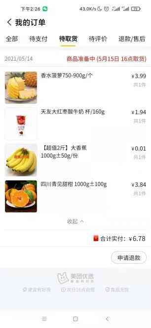 記者日前在某社區(qū)團(tuán)購平臺新注冊用戶,隨即購買了一些生鮮商品:一個近2斤重的菠蘿、一瓶酸奶、2斤香蕉和2斤甜橙,總共花費(fèi)6.78元,這個價格遠(yuǎn)低于周圍菜市場和生活超市的售價。其中,作為新注冊用戶的福利,2斤香蕉作價僅1分錢。