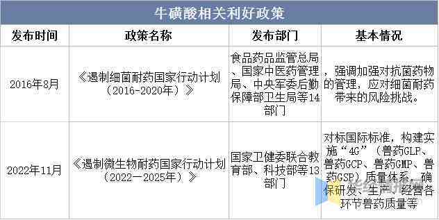 長期以來,在飼料生產(chǎn)過程中過度使用抗生素已經(jīng)導(dǎo)致耐藥菌的嚴(yán)重污染,日益成為公共健康的重大威脅。全球多個國家已經(jīng)出臺相應(yīng)政策,限制或禁止在飼料領(lǐng)域使用抗生素。我國國家衛(wèi)計委在2016年等14個部門聯(lián)合制定了《遏制細(xì)菌耐藥性國家行動計劃(2016-2020)》,強(qiáng)調(diào)加強(qiáng)對抗菌藥物的管理,應(yīng)對細(xì)菌耐藥帶來的風(fēng)險挑戰(zhàn)。隨后在2022年再度提出《遏制微生物耐藥性國家行動計劃(2022-2025)》進(jìn)一步提升管理水平,而?;撬峋哂刑岣邫C(jī)體免疫力的功能,已經(jīng)逐步在飼料添加劑中使用,隨著全球禁用抗生素政策的深化,牛磺酸作為健康的氨基酸,其對抗生素的替代預(yù)期使得該行業(yè)具有極大的發(fā)展空間。