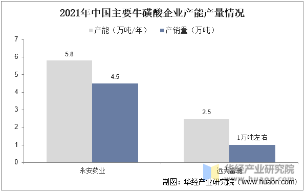 全球牛磺酸產(chǎn)能除日本等少量生產(chǎn)外主要集中在中國,國內(nèi)永安藥業(yè)、遠(yuǎn)大富馳(原黃岡富馳)江陰華昌和常熟遠(yuǎn)洋等占比全球?;撬岙a(chǎn)能近九成,其中經(jīng)過了藥品GMP認(rèn)證的永安藥業(yè)和黃岡富馳的裝置產(chǎn)能占比超七成,截止2021年產(chǎn)能分別約5.8萬噸和2.5萬噸左右,其中2021年永安藥業(yè)牛磺酸產(chǎn)銷量出現(xiàn)明顯增長,達(dá)4.5萬噸。