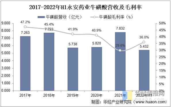 永安藥業(yè)牛磺酸產(chǎn)業(yè)經(jīng)營現(xiàn)狀來看,作為全球最大的?;撬嵘a(chǎn)企業(yè),產(chǎn)能占比全球超50%,其中超八成主要用于出口。永安藥業(yè)拓展?;撬嵘嫌苇h(huán)氧乙烷,目前產(chǎn)能已達(dá)4萬噸,一定程度上減輕產(chǎn)業(yè)原料帶來的經(jīng)營壓力。值得注意的是,受產(chǎn)業(yè)整體競爭加劇和環(huán)保壓力持續(xù)增長,2017年華安藥業(yè)牛磺酸毛利率持續(xù)下降,尤其是2021年雖然銷量達(dá)近年新高,但整體毛利率下降明顯,主要受上游成本壓力增大影響。2022年來看,全球永安藥業(yè)?;撬釥I收增長明顯,毛利率水平雖仍不及2020年以前水平,但相較2021年明顯回升。