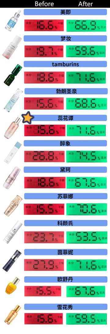 最終,蕊花譚以增加56%的水分獲得名!而蘇菲娜則以0.9%的超微弱差距位居第二,可以說是不相上下。第三名的雪花秀也只和第二位相差1.1%??偟膩碚f前9位精華的滋潤度都不錯,差距都在1-2%之間。