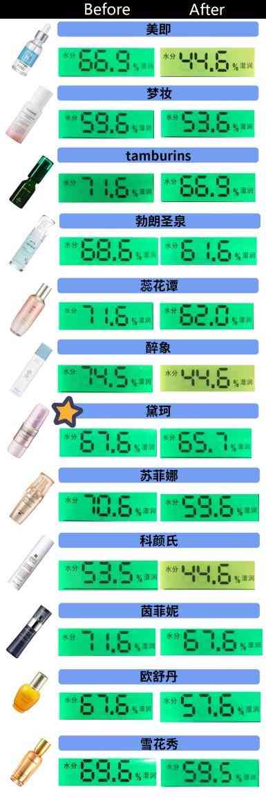 黛珂的前后數值差距只有1.9%,絕對是名副其實的保濕度名!位居第二名的茵菲妮也不錯,前后也只相差4%。而tamburins有點可惜,和茵菲妮的差值只有0.7%,只能成為第三名啦!