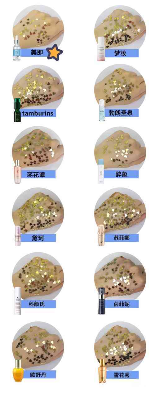 把等量精華涂抹在手背上,等待兩分鐘之后撒上小亮片,再將手反復翻轉5次,倒掉多余的亮片。
