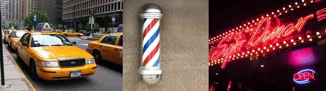 而“行業(yè)”也有職業(yè)形象,也就是“行業(yè)特征”。許多行業(yè)都有特定的視覺表達:代表出租車的“特別配色”,代表發(fā)廊的“轉(zhuǎn)燈”,代表娛樂場所的“霓虹燈”。