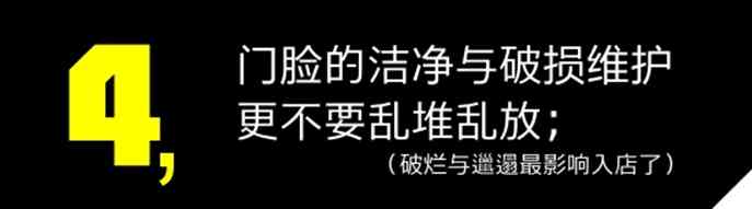 沒錯,店門口的一切,包括臺階,擺放的廣告,做堆頭的促銷品,還有店內(nèi)明亮的燈光,只要顧客路過能看到的,都是門臉的一部分,只要影響形象,都要果斷整改。