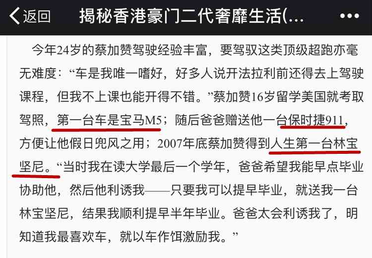 蔡加贊臺(tái)車是寶馬M5,之后得到一臺(tái)保時(shí)捷911用來兜風(fēng),大學(xué)的時(shí)候,父親為了獎(jiǎng)勵(lì)他提早半年畢業(yè),送了一輛蘭博基尼: