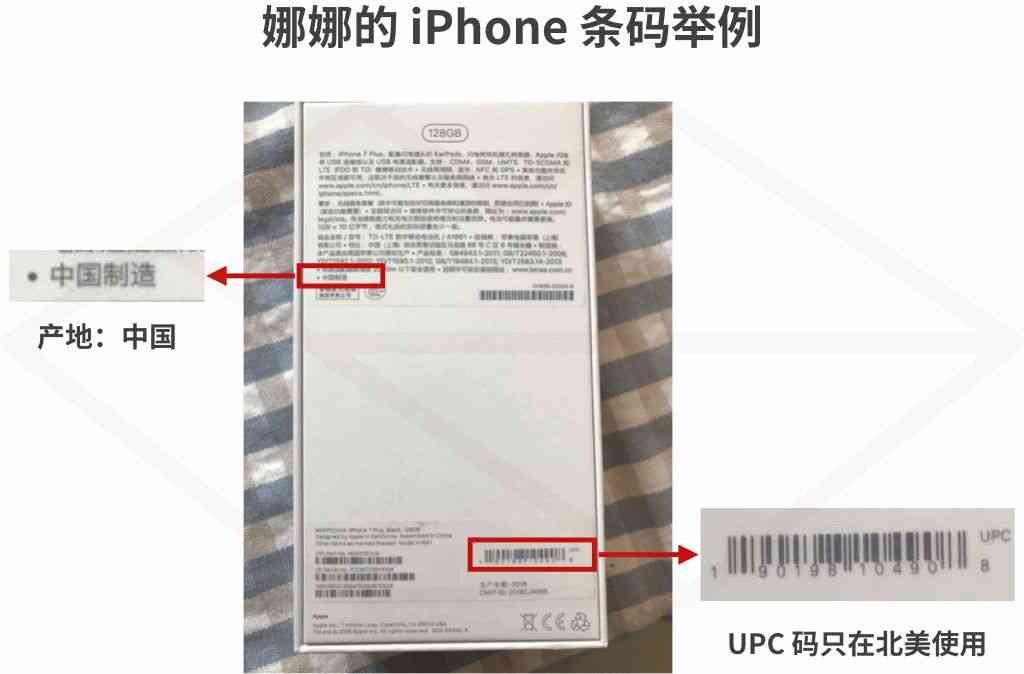 舉個例子,下面圖片是娜娜的 iPhone 包裝盒,右下角的 UPC 編碼是只在北美使用的一種編碼方式,看這個樣子會覺得是北美的。但我們都知道大多數(shù) iPhone 都還是在國內(nèi)生產(chǎn)的,娜娜的這臺也不例外,在包裝盒上有直接標(biāo)明。